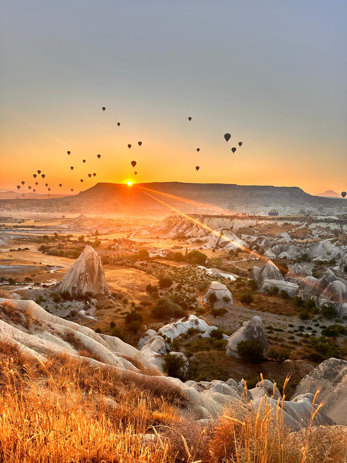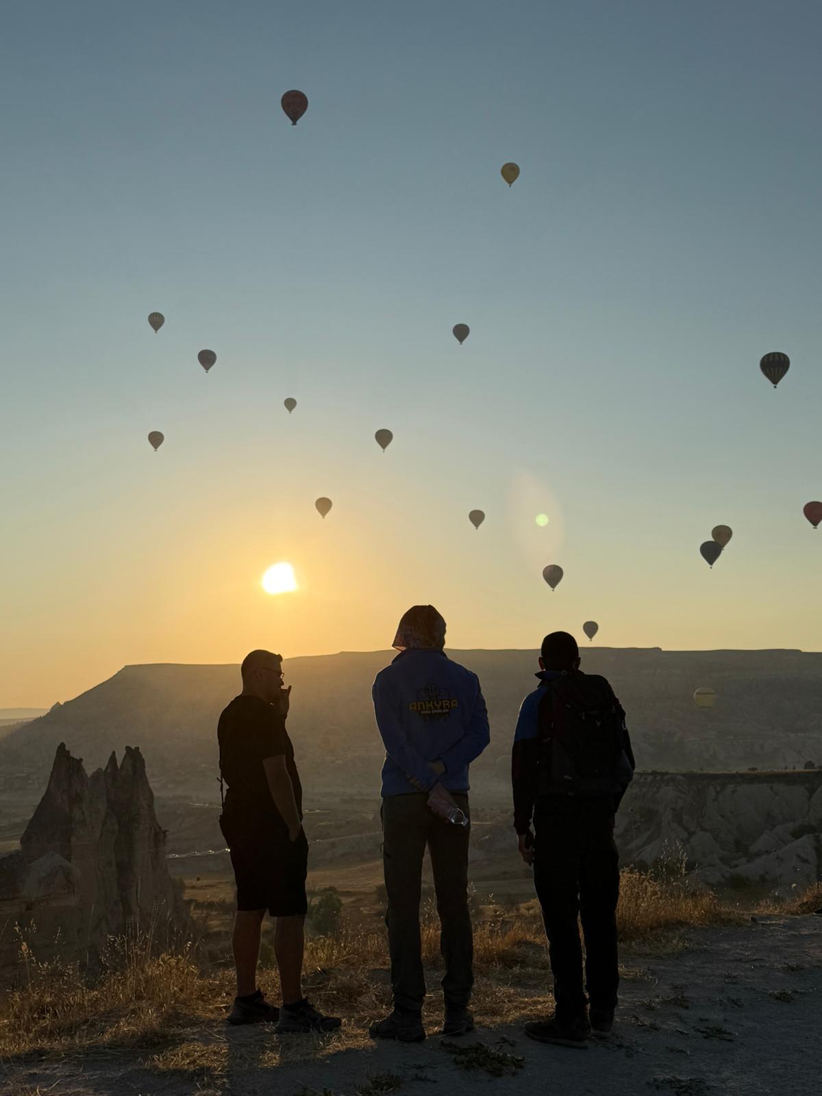 🎈🌅 Faaliyetimizin en unutulmaz anlarından biri, sabahın erken saatlerinde balon kalkışları için verilen nihai hava durumuna ilişkin bekleyiş oldu. Kalkış iznini simgeleyen yeşil bayrağın web sitesi üzerinden güncellenmesi ve ilk ateşlerin yükseldiğini gördüğümüzde ekipte büyük bir sevinç ve heyecan yaşandı. İlk balonların havalanışına yerinde tanıklık edebilmek amacıyla vakit kaybetmeden Aşıklar Tepesi’ne geçildi. Burada hem gökyüzünü renk cümbüşüne çeviren balonları seyrettik hem de gün doğumunu izleyerek Kapadokya’nın masalsı siluetine şahit olduk. Katılımcılar bu anları fotoğraflarla belgeledi; disiplinli şekilde belirlenen alanlarda konumlanarak kalabalıkla uyumlu ve güvenli bir izleme düzeni sağlandı.