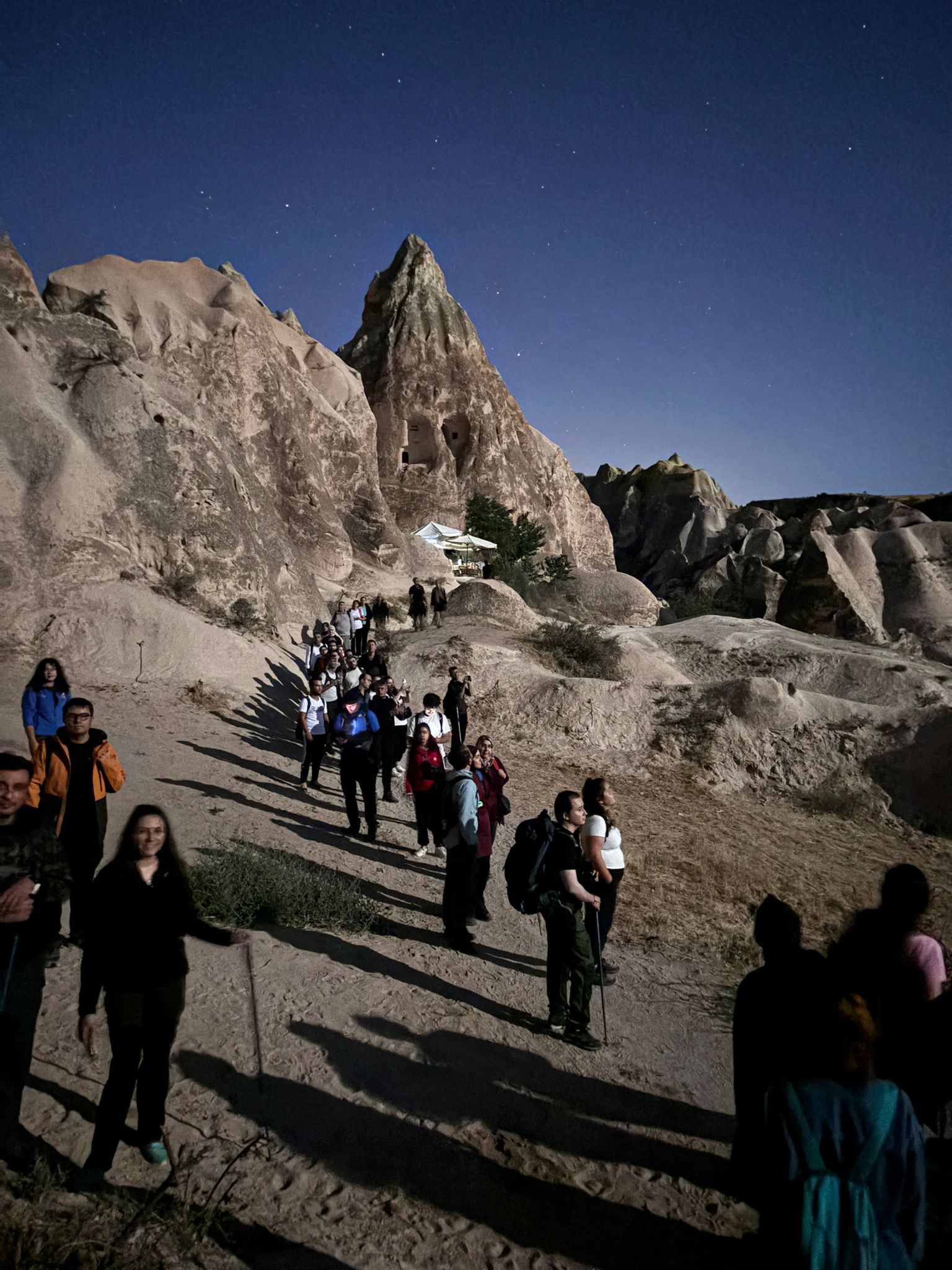 🥾🌙 Yürüyüşümüz Kızılçukur Vadisi girişinden itibaren dolunayın sağladığı doğal aydınlık ve uygun hava koşulları altında, güvenli ve temkinli bir tempoda sürdürüldü. Bölgenin doğal dokusunu ve jeolojik oluşumlarını korumaya azami dikkat edilerek, patika dışına çıkmadan ilerleme prensibi benimsendi. Parkur boyunca rehber ekip, grubun bütünlüğünü koruyacak şekilde öncü–artçı düzeniyle hareket etti; molalarda su ve enerji takviyesi için yeterli süre tanındı. Rota üzerinde yer alan Haçlı Kilise ziyaret edilerek, mekânın tarihi ve kültürel önemine dair kısa bilgilendirme yapıldı. Yürüyüş Göreme merkez istikametinde, planlandığı şekilde ve grubun tamamıyla başarıyla sonlandırıldı.