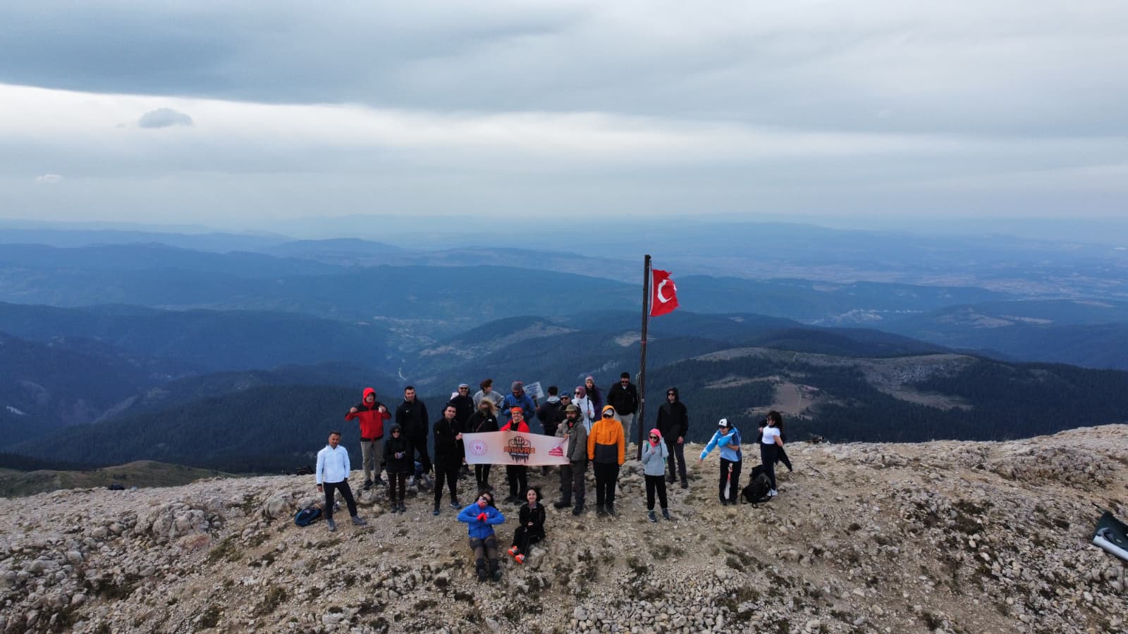Zirvede, 2.587 metrelik yüksekliğin getirdiği açıklık hissi ve rüzgârla birlikte, rotanın geride kalan bölümüne dönüp baktığımızda çizdiğimiz hattın netliği yüzlere yansıyan bir memnuniyete dönüştü. Geniş ufuk çizgisinde, kuzeyin sık ormanları ve güneyin dalgalı platosu iki farklı coğrafi karakteri tek bir manzarada birleştiriyordu. Kısa bir mola boyunca, grup olarak hem manzaranın hem de başarının tadını çıkardık; dayanışma, uyum ve temkinli ilerlemenin bizi buraya taşıdığını bilerek.